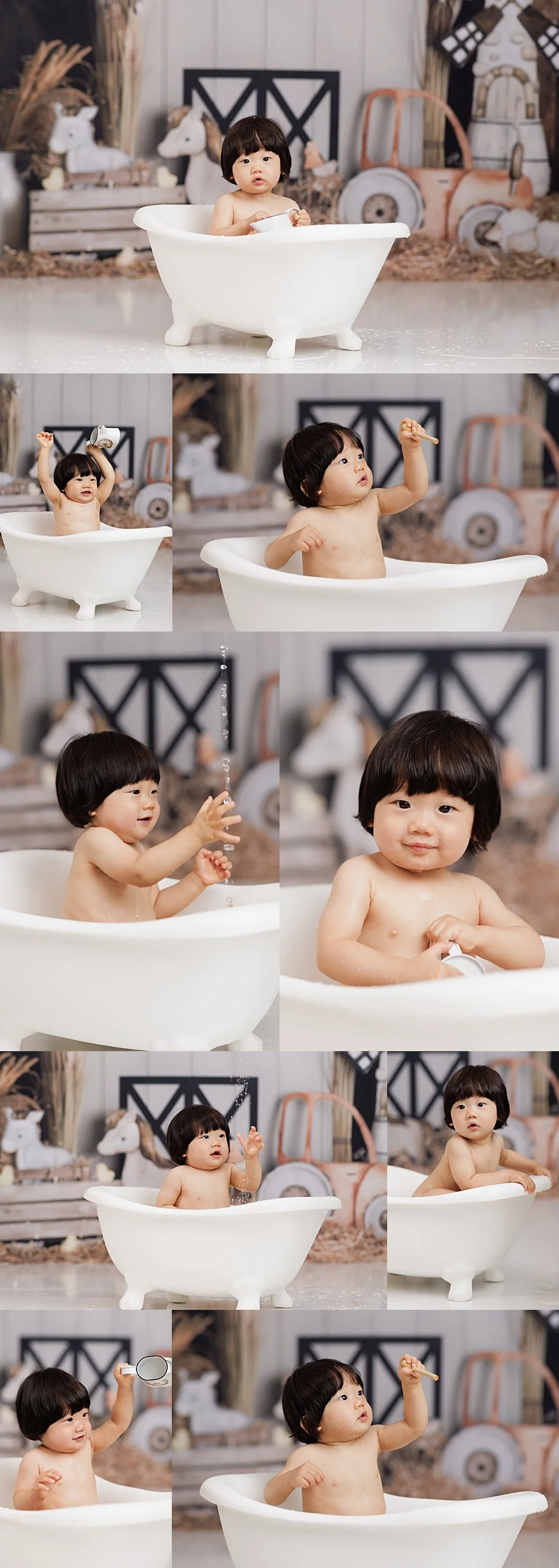 The little white tub filled with warm water is always a favorite with babies. It allows them to relax, play, and wash off the frosting while creating some of the cutest photos of the entire session.