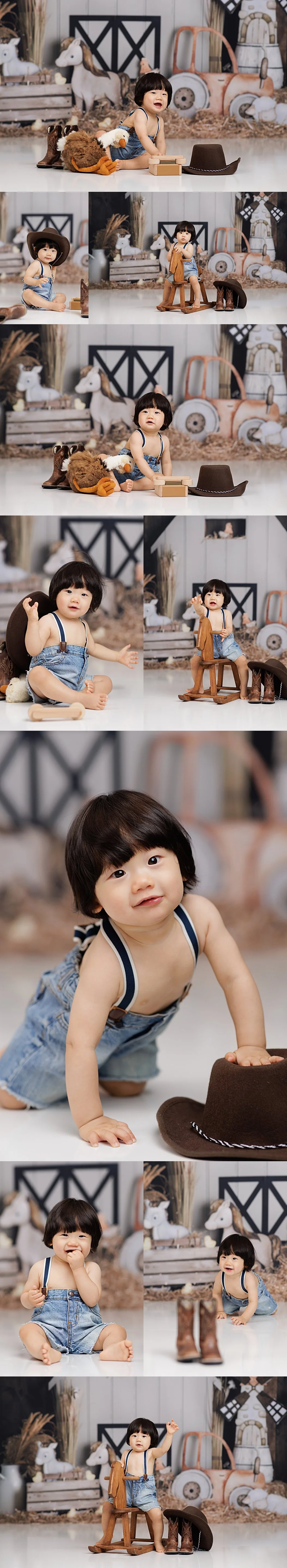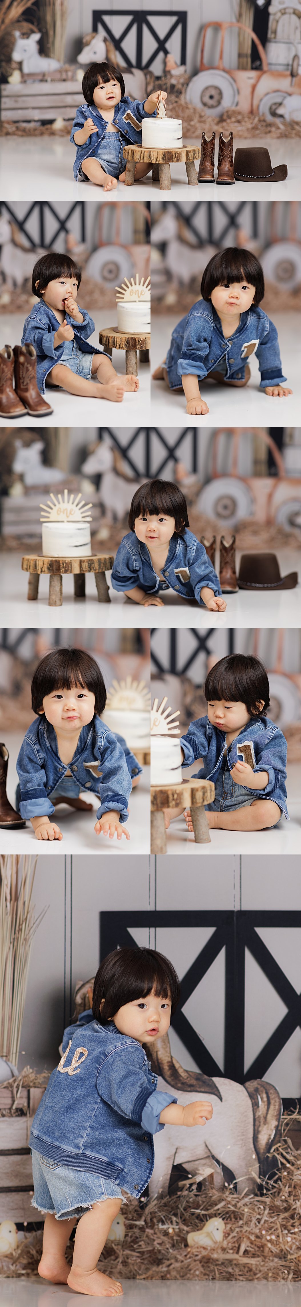 Before bringing out the cake, we always begin with some clean portraits so babies can explore the set and warm up to the camera. This sweet birthday boy looked absolutely adorable in his denim overalls and little cowboy hat, perfectly matching the rustic farm theme.